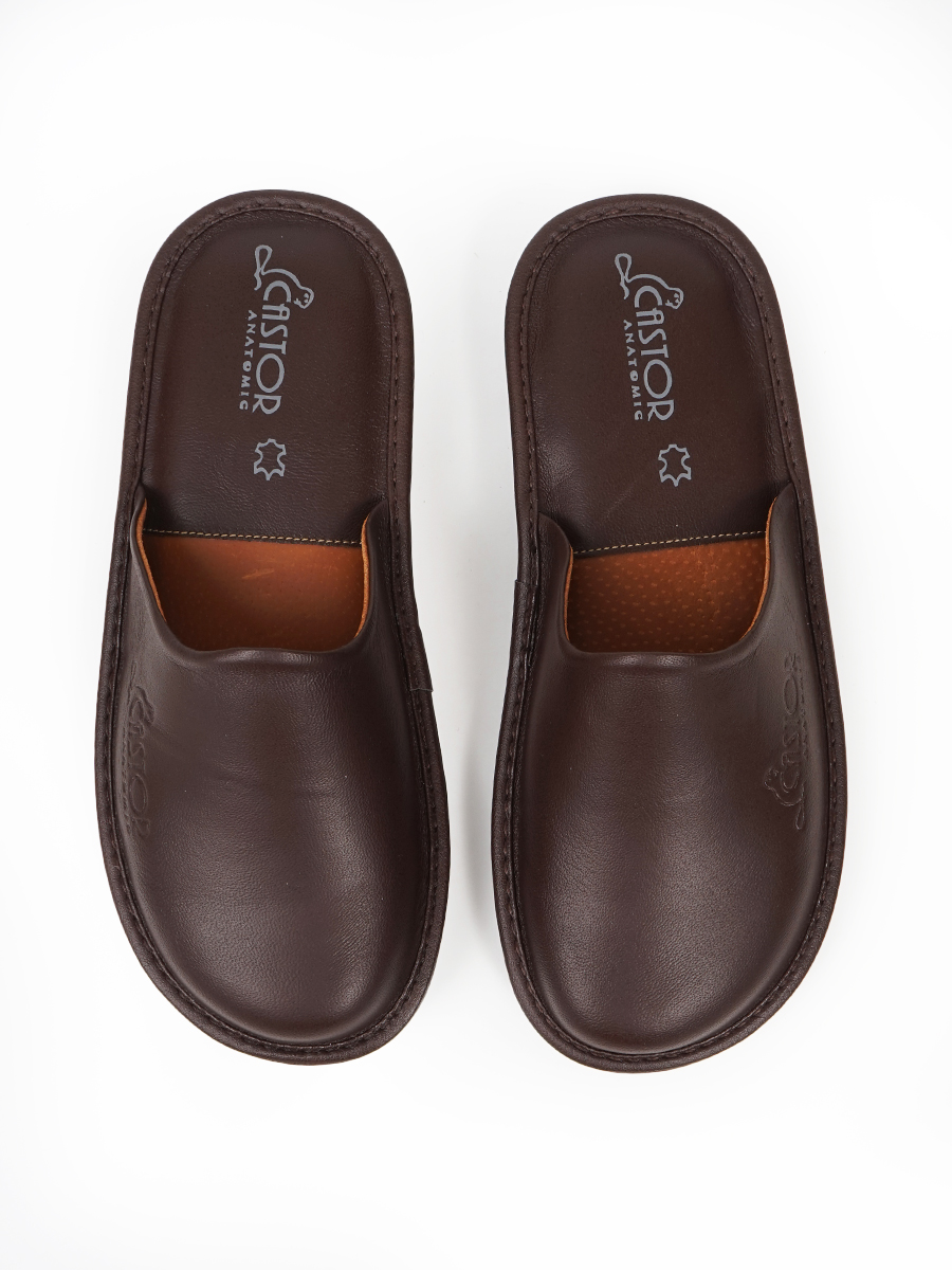 Ανδρική παντόφλα,ελληνικής κατασκευής,εξ΄ολοκλήρου από γνήσιο δέρμα,της εταιρείας Castor με με κομψό κεντημένο σχέδιο στο μπροστινό του μέρος.Διαθέτει αφρώδες μαλακό ανατομικό πέλμα και ευλύγιστη σόλα για άνεση και απορρόφηση των κραδασμών.