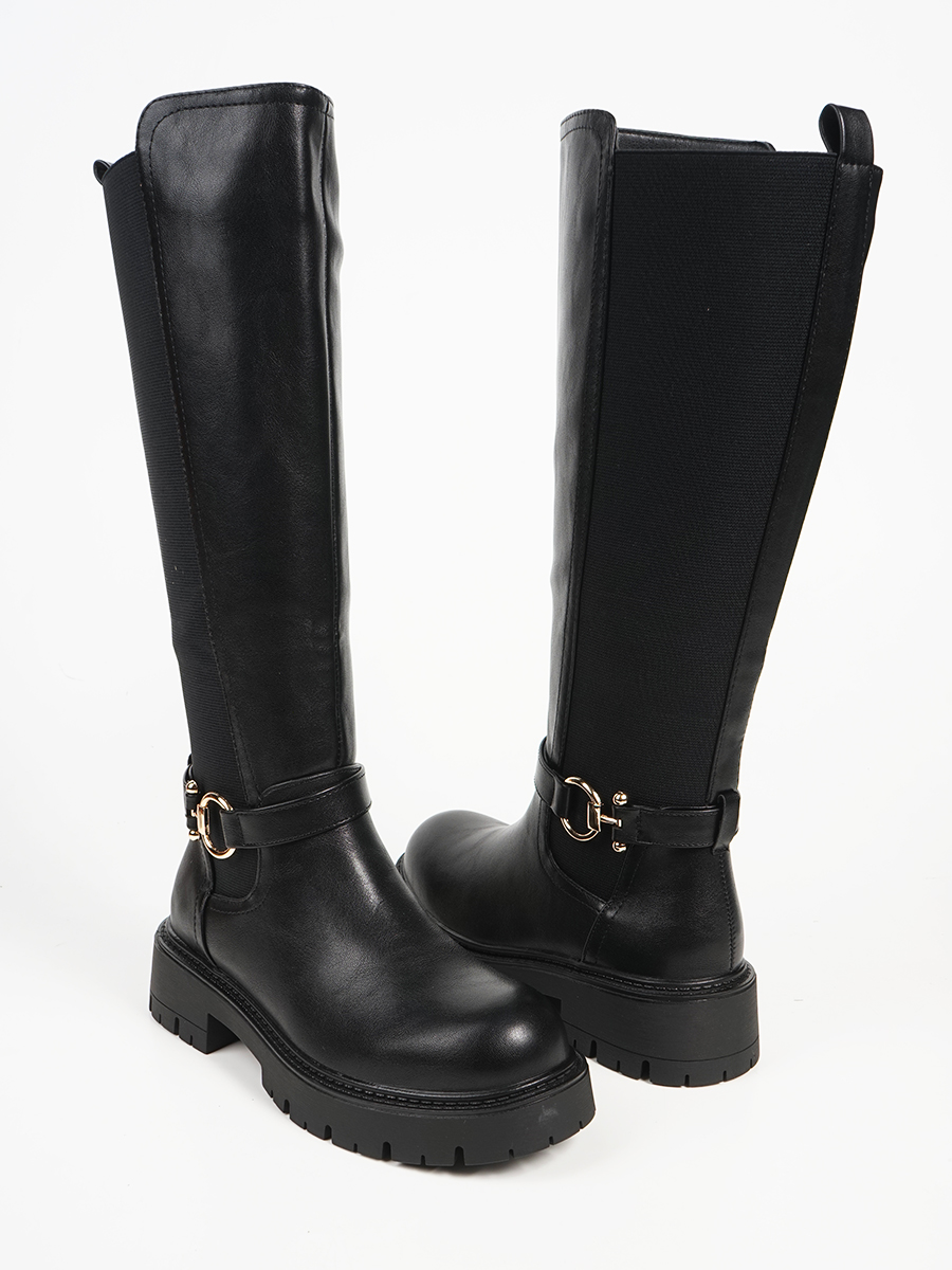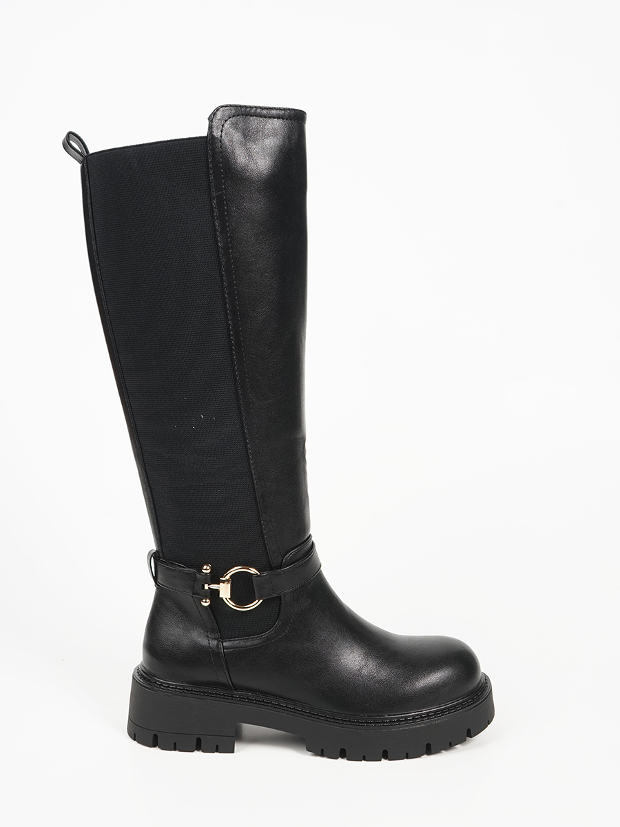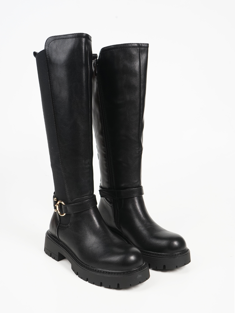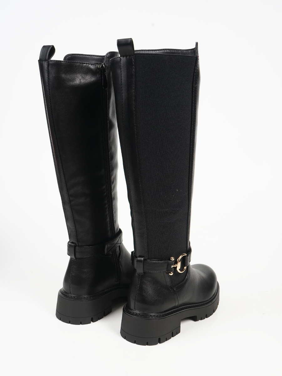 Γυναικείa μπότα με λουράκι και χρυσές λεπτομέρειες. Διαθέτει λάστιχο και φερμουάρ, ιδανική επιλογή για κομψές και εντυπωσιακές εμφανίσεις. Προσφέρει άνετο και σταθερό πάτημα.