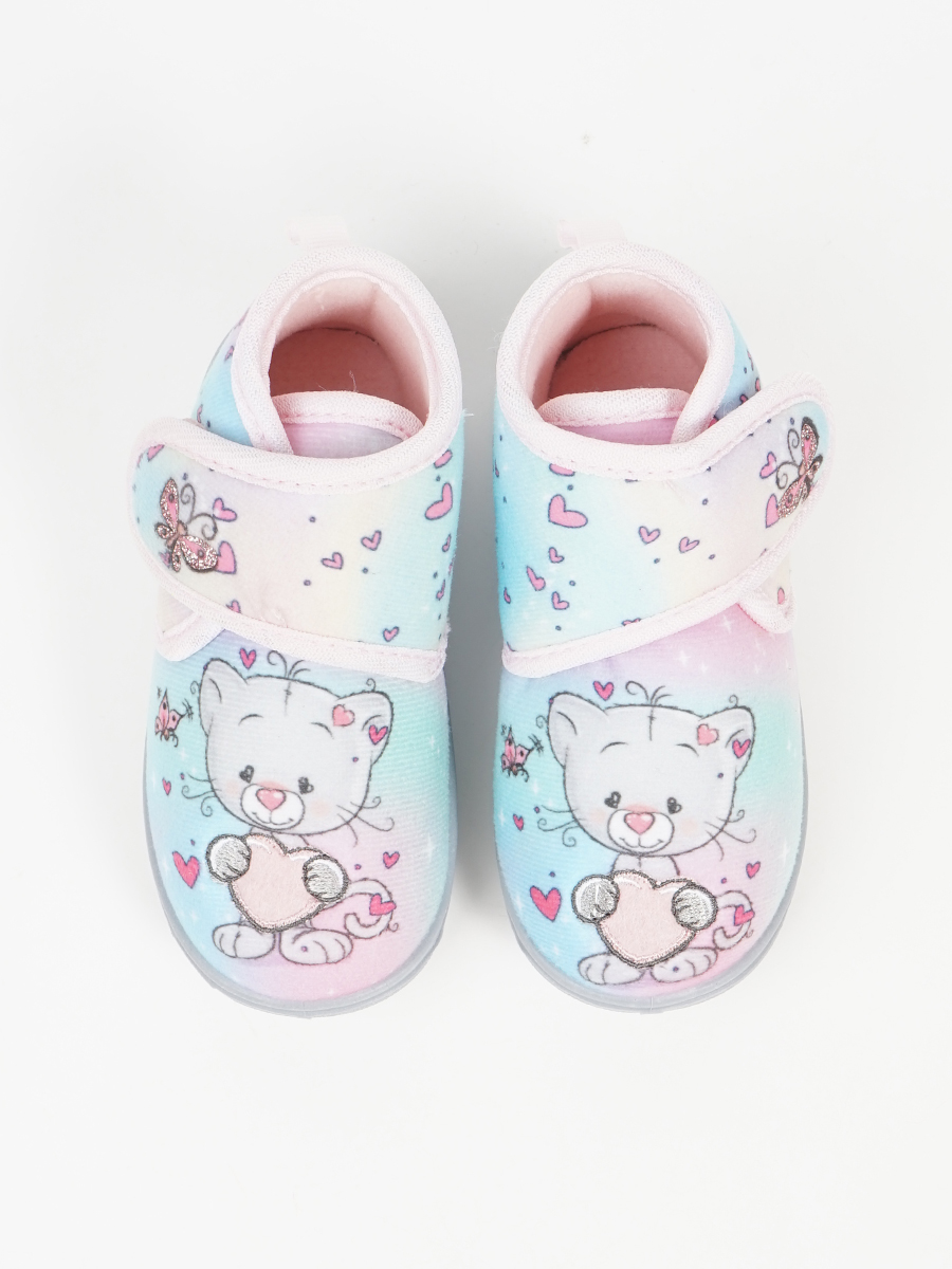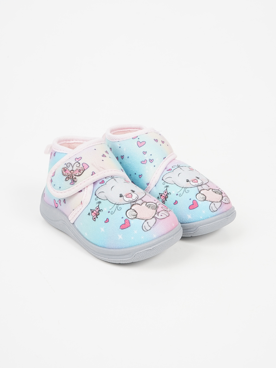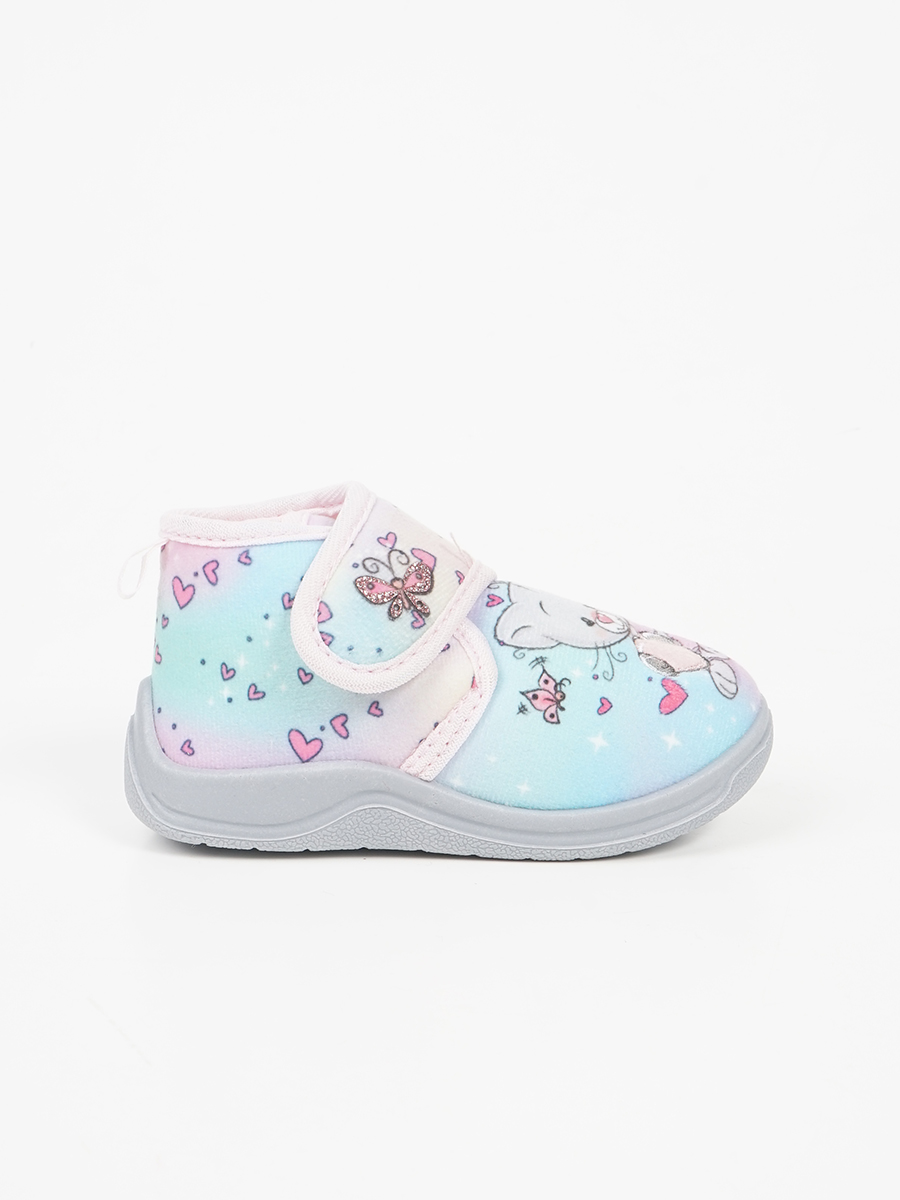 Παιδική παντόφλα τυπού μποτάκι με αυτοκόλλητο και σχέδια στο μπροστινό μέρος.